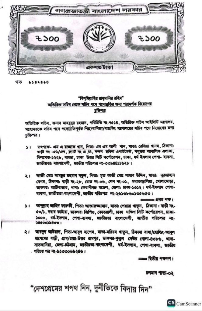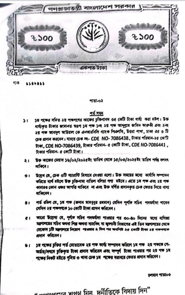 সবচেয়ে বড় চুক্তিটি করা হয় জাতীয় রাজস্ব বোর্ডের (এনবিআর) চেয়ারম্যান হওয়ার জন্য। এই পদের জন্য ৩০০ কোটি টাকার একটি অবিশ্বাস্য চুক্তি করেছেন তিনি। অভিযোগ রয়েছে, এই বিপুল পরিমাণ অর্থ কয়েকটি ধাপে পরিশোধের কথা ছিল এবং এর গ্যারান্টি হিসেবে বিভিন্ন ব্যাংকের চেক ব্যবহার করা হয়েছে।