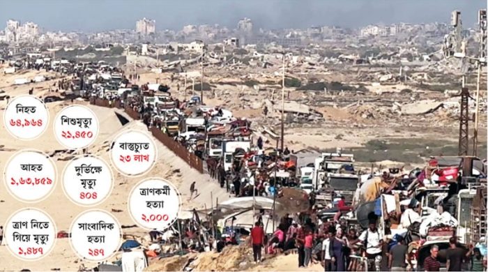 ফিলিস্তিনের গাজা উপত্যকায় চলমান যুদ্ধের কারণে মানবিক বিপর্যয় ভয়াবহ রূপ নিয়েছে। আন্তর্জাতিক গণমাধ্যম ও মানবাধিকার সংস্থার তথ্য অনুযায়ী, ইসরায়েলের অব্যাহত বিমান ও স্থল হামলায় নিহত ফিলিস্তিনিদের সংখ্যা ৬৫ হাজার ছাড়িয়েছে।